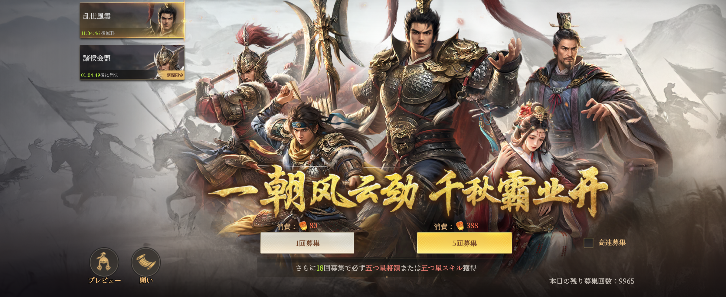βテストでは星5武将53体。星5スキルが59個ありましたので星5の排出率が8%(武将、スキルそれぞれ4%)と高いですが特定の武将やスキルを狙うのは難しいかもしれません