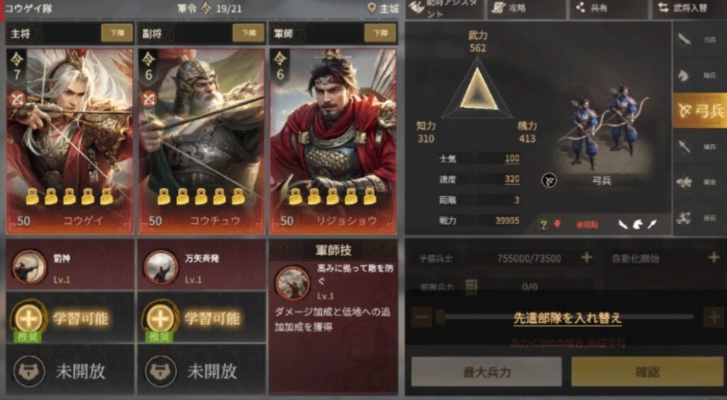 部隊数が増えるほど「役割分担」が重要になります。又、それぞれの部隊を武力や知力等の攻撃種別を考えるのも重要です。