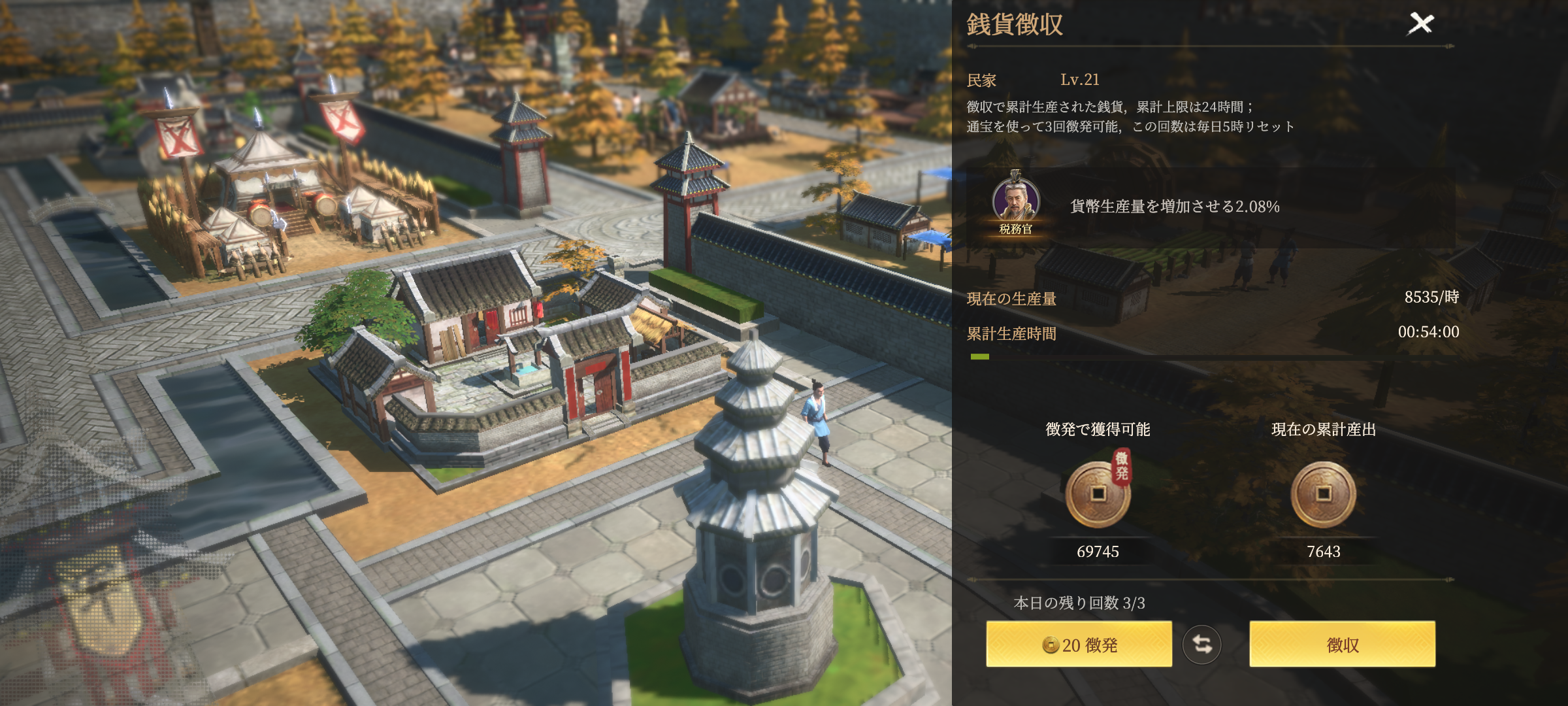 銅貨を安定して確保するためには、民家のレベルや内政武将の内政値やスキルレベルを上げて産出量を増やすことが重要になります。